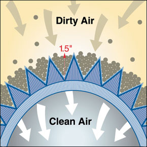 | 全新概念,將濾材褶高從標(biāo)準(zhǔn)的2英寸(50mm) 縮短至1.5英寸(38mm),避免了折疊、壁塌或彎折令灰塵積聚在夾縫中的可能性。堅(jiān)固的短褶濾筒, 能使反吹清潔更有效。 |